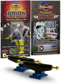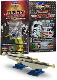 Propaganda Industries je značka s velmi osobitým stylem která vyrábí špičkový hardware pro fingerboarding. Orion 2Tone Wide Trucks jsou další úrovní trucků této značky. (tech sheet). Orion jsou první multitónové trucky v kategorii středního segmentu který obsahuje stejně jako plně profesionální trucky systém osiček s matičkami. V šířce Classic Wide, kompatibilní s fingerboardy které prodáváme. Trucky mají kvalitní základnu a osičky a nepotřebují žádný dodatečný TTS tuning. Fingerboard Trucky Propaganda Orion Trucks jsou osazeny poslední verzí Propaganda Soft-Turn bushingy díky kterým bude jízda na nich jemná a přesná a jsou také připraveny na další, pokročilejší tuning v podobě plně profesionálních bushingů Propaganda Revolution Bushings, které nabízí realistický tvar skateboard bushingů s výhodou varibility dodávaných tvrdostí, můžete si tak do trucků osadit bushingy rozdílných tvrdostních stupňů a přizpůsobit chování trucků požadovanému stylu jízdy což u jiných trucků v tomto segmentu možné není. Propaganda Orion jsou vhodné jak pro pokročilejší jezdce, tak i pro začátečníky kde nabídnou skvělou funkčnost. Plně kompatibilní pro použití s ložiskovými a neložiskovými kolečky např. Bollie Wheels, Winkler Wheels a další. Originální balení trucků Propaganda Orion obsahuje 2ks podvozků a zdarma originální balení Propaganda-Industries First Aid Kit - prémiového hardware pro fingerboard desky.