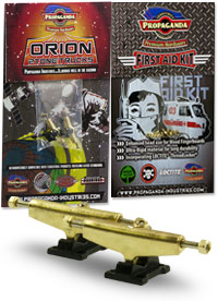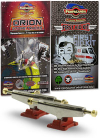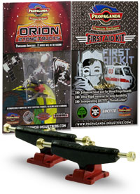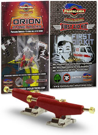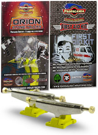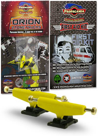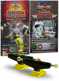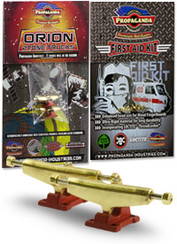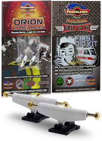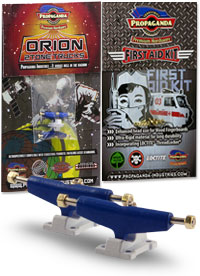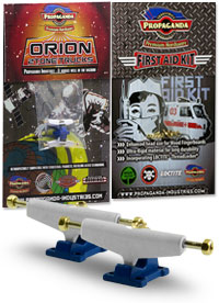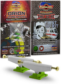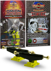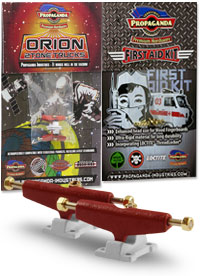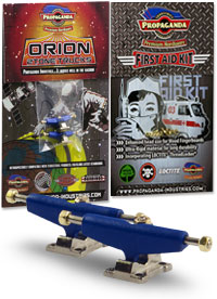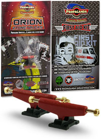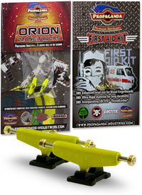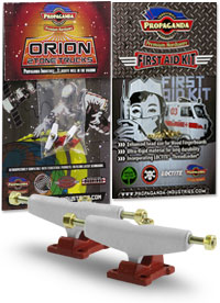 . Orion jsou první multitónové trucky v kategorii středního segmentu v šířce Classic Wide, kompatibilní s fingerboardy a kolečky od ostatních výrobců. Trucky Orion mají kvalitní základnu i osičky a nepotřebují žádný dodatečný tuning. Fingerboard Trucky Propaganda Orion jsou osazeny silentbloky Propaganda Soft-Turn Bushings™, díky kterým je jízda na podvozcích Orion jemná a přesná. Všechny řady trucků Propaganda mohou být pomocí dostupného kitu vylepšeny profesionálními bushingy Propaganda Revolution Bushings, s realistickým tvarem skateboard bushingů a výhodou varibility rozdílných tvrdostních stupňů. Tímto je umožněno přizpůsobit chování trucků Propaganda Orion požadovanému stylu jízdy, což u jiných výrobců fingerboard trucků v této cenové kategorii nelze. Trucky Propaganda Orion jsou vhodné jak pro pokročilejší jezdce ale i začátečníky kde nabízí skvělou funkčnost bez nutnosti dalších vylepšení. Trucky Propaganda Orion jsou kompatibilní s ložiskovými i neložiskovými kolečky např. Bollie Wheels, Winkler Wheels, United a mnoha dalších. Originální balení trucků Propaganda Orion obsahuje 2ks podvozků a zdarma originální balení Propaganda-Industries First Aid Kit - prémiového hardware pro fingerboard desky.